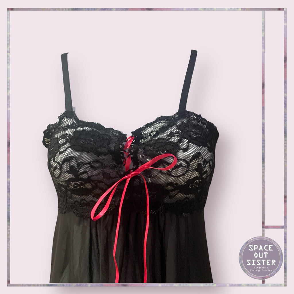 Slip into sweet dreams with our Vintage Music Legs Nightdress! This adorable black lace number, topped with a cerise ribbon, is like a cozy hug for your nighttime shenanigans. Perfect for when you want to look cute while snoozing or just lounging in style.