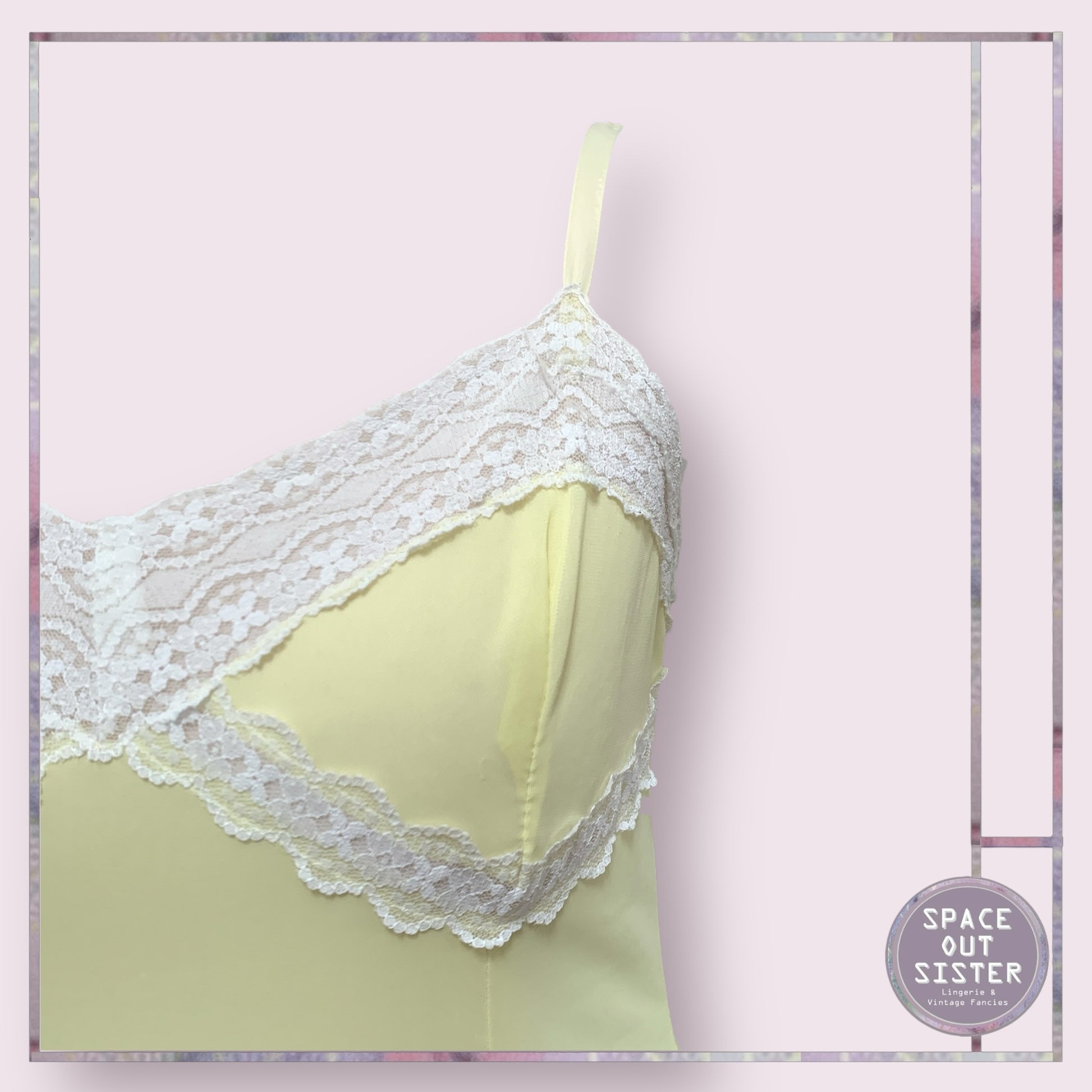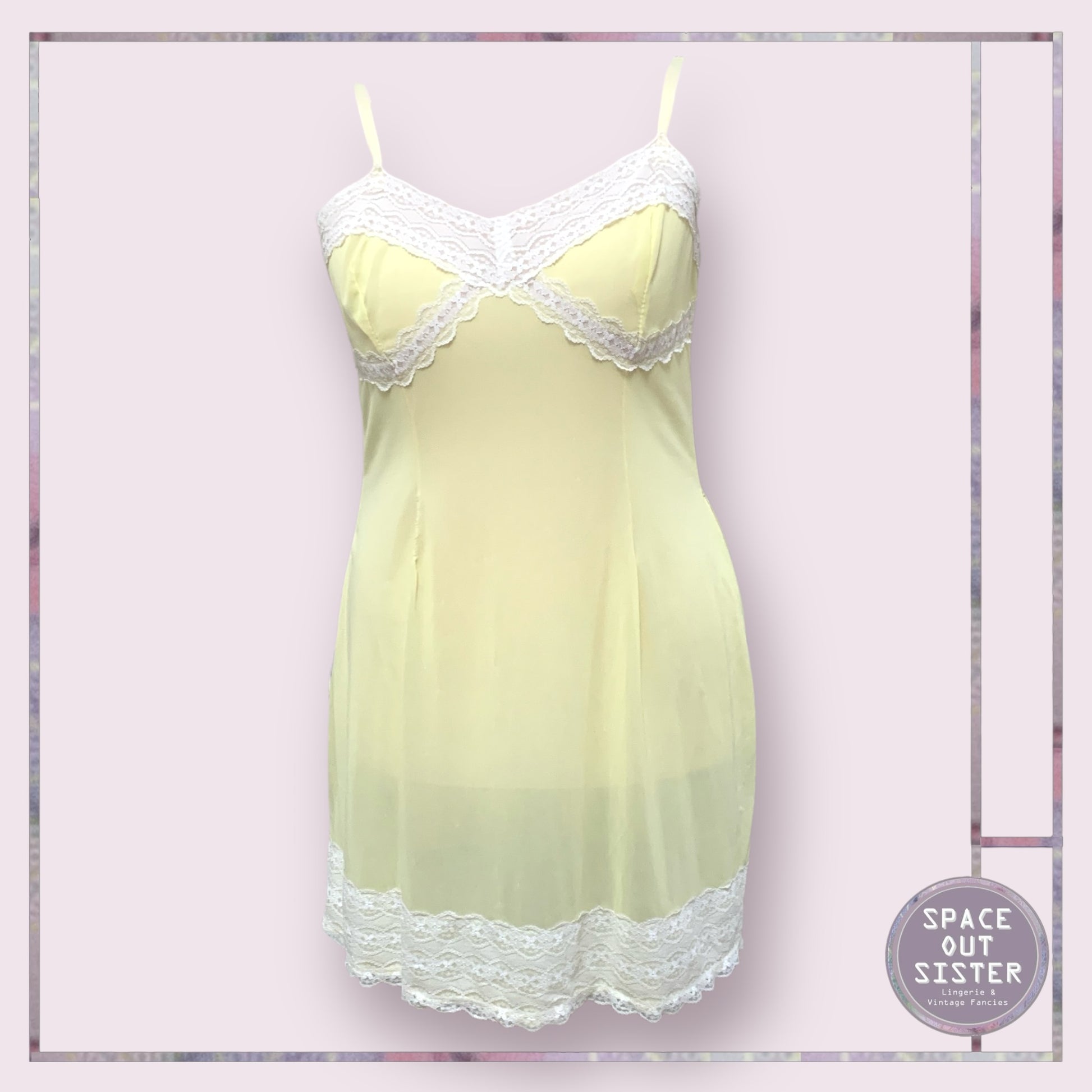 Embodying the essence of timeless elegance, the Vintage Bayer Lemon Slip presents a delightful interplay of vintage charm and contemporary sophistication. Its knee-length design, adorned in a resplendent lemon hue, with white lace, not only flatters the silhouette but also evokes the vibrancy of sun-drenched orchards, making it an exquisite addition to any discerning wardrobe.