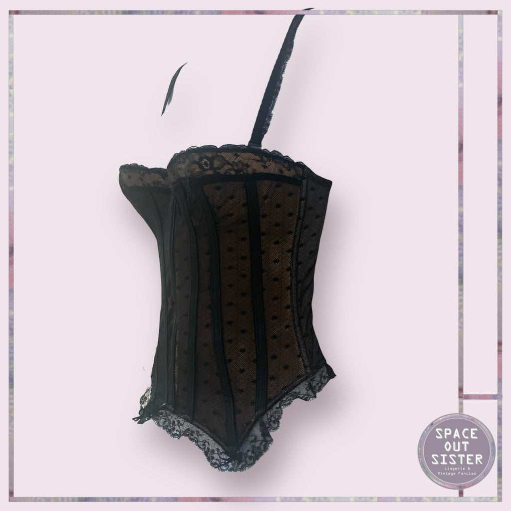 The Chantal Thomass Bustier in taupe features an elegant black lace overlay that enhances its aesthetic appeal. The adjustable straps and hook-and-eye fastening ensure a tailored fit, contributing to a flattering silhouette. This piece is designed for both comfort and style, making it a versatile addition to any wardrobe.