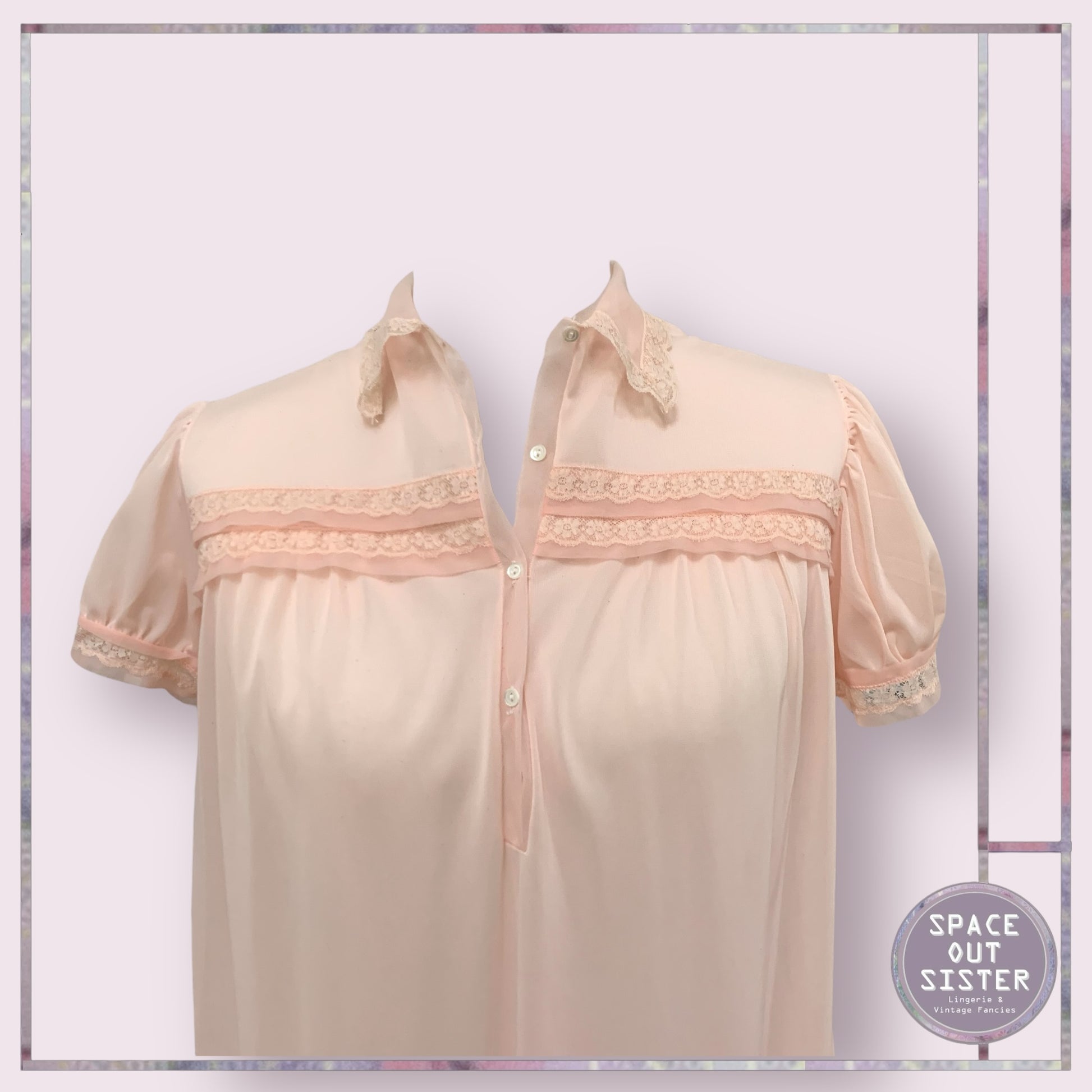 Enveloped in the delicate hues of barely-there peach, the Vintage Valisere French Charm Nightdress embodies an ethereal grace. Its ornate button front closure harmonizes with lace delicately entwined around the neckline and collar, creating an exquisite silhouette that whispers of timeless elegance and romantic allure. Embrace the night in this enchanting garment, a sublime tribute to the art of languid luxury.